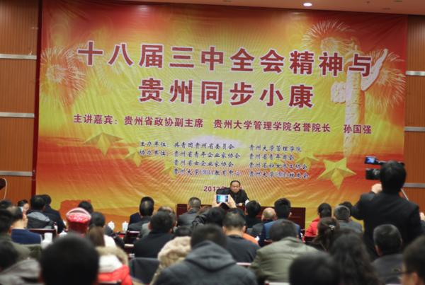 2013年12月15日下午,由共青团贵州省委、乐动官方网站主办,贵州省青年企业家协会、贵州省青年商会、贵州省女企业家协会、贵州省妇女手工协会、贵州大学EMBA教育中心、贵州大学EMBA校友会承办的“党的十八届三中全会精神与贵州同步小康”专题讲座在贵州省政协议政厅举行。省政协副主席、乐动官方网站名誉院长孙国强教授受邀作专题讲座。讲座由共青团贵州省委马宁宇书记主持,省妇联罗宁主席出席了讲座。来自省青年企业家协会、省青年商会、省青年创业就业基金会、乐动官方网站EMBA&MBA校友共300余名青年企业家聆听讲座。