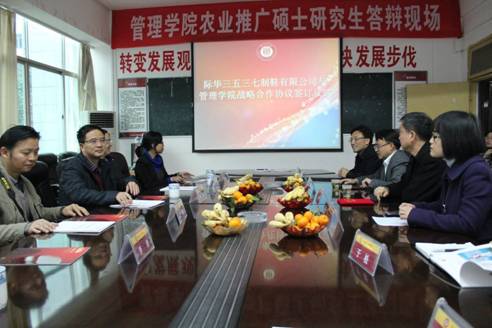 2013年12月6日,际华三五三七制鞋有限公司与我院战略合作协议签订仪式暨客座教授受聘仪式在我院309室成功举行,际华三五三七制鞋有限公司的董事长杜江、副总经理杨俊、人力资源部部长毛常月、党务部部长张伟,我院党委书记陶玉顺、院长李烨、副院长林岚涛、副院长王婷、党委副书记于松出席仪式, 我院EMBA教育中心、MBA教育中心、研究生科负责人参加了仪式。
