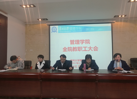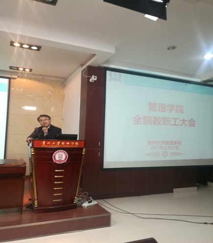 最后,李烨院长对学院近期工作做了如下总结:一是学院成功承办贵州大学波罗的海区域研究中心揭牌仪式暨“一带一路”跨国知识青年创新创业高端论坛,波罗的海区域研究中心是目前学校唯二的区域研究中心,学院将紧跟国家开放、国际化发展步伐,紧跟学校国际化办学政策,提高学院国际化水平,明年将派出一定数量的老师,支援冈比亚大学MBA课程建设;二是科研方面,围绕“双一流”建设,学校正在积极制定方案并向省里争取更大支持,国家对高校科研工作的支持力度越来越大,做好科研,既是管院教师自我提升的主要路径,也是作为一名高校教师履行教师职责的要求,希望全院教师,特别是尚未主持过国家课题的青年老师,积极申报国家级项目;三是学院近期工作重点之一是推进落实系和部分中心重组工作,将系、相关中心建设成为推进管理学院“双一流”建设的重要组成部分和支撑力量,并将党建与系建设结合起来,推进学院一流学科、一流专业的建设。李院长表示,学院处于转型升级发展关键阶段,希望所有教职工能将个人发展与学院发展紧密结合,推动个人、学院事业上新台阶!