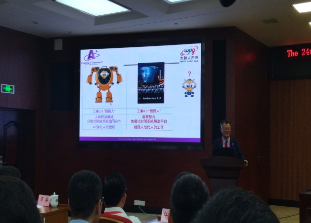 在主题报告阶段,首先由来自台湾清华大学的简祯富教授作了题为“对智能制造的破坏性创新——大数据分析和人工智能增强的工业3.5”,简教授从微观具体个案到宏观产业发展趋势介绍了工业3.5的概念和特点。随后,由来自香港科技大学的黄教授(George G.Q Huang)做了题为“智能物理英特网的零库存制造”的主题报告,墨尔本大学的Russell教授做了关于“用于城市物流和改善交通网络快速恢复的模型”的主题报告。下午由来自上海交通大学、名古屋大学、和北京航天航空大学的三位教授分别作了主题报告。