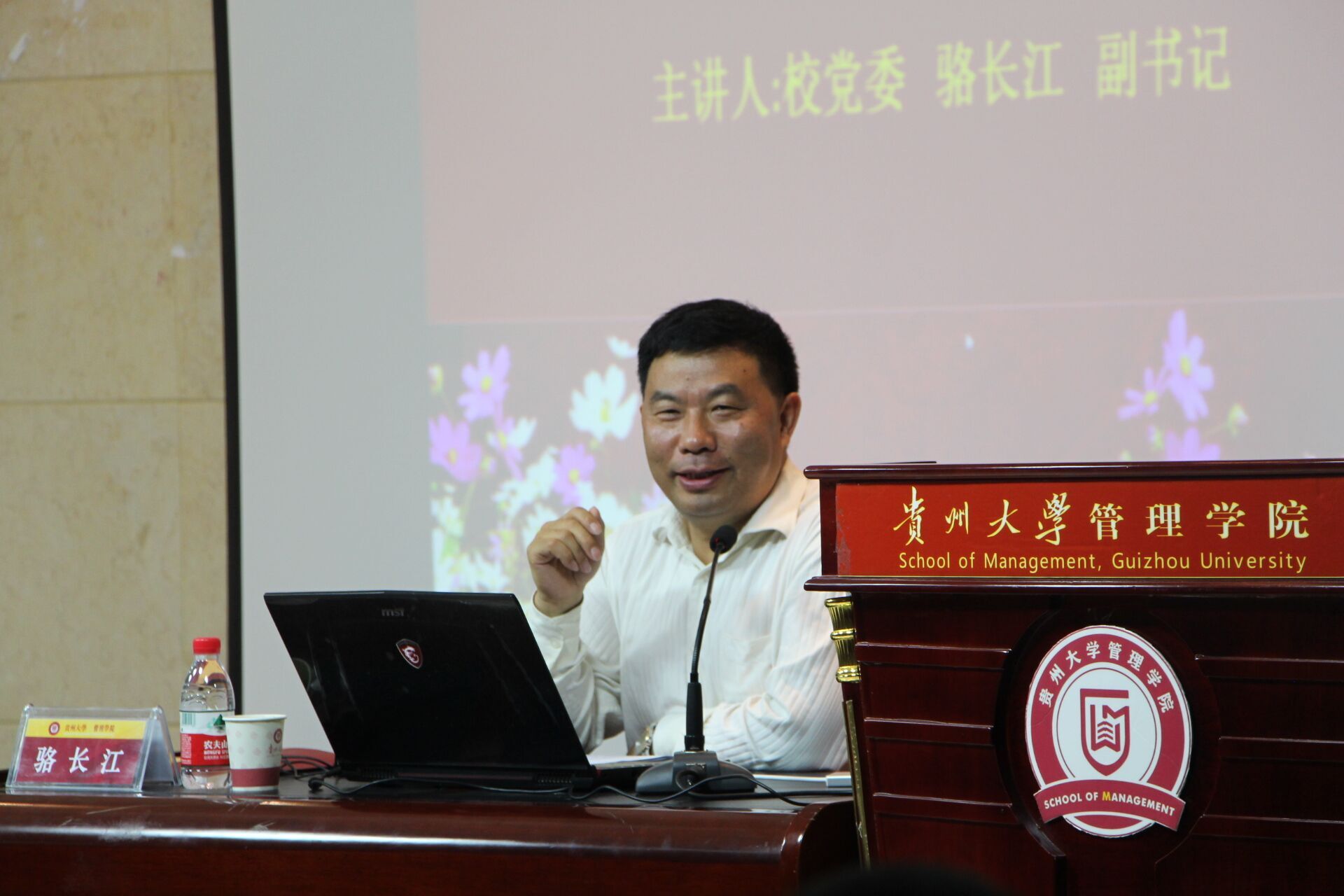 为认真贯彻落实教育部、贵州省教育厅和学校关于认真做好“学习新思想千万师生同上一堂课活动”,教育引导广大师生深刻领会习近平总书记在北京大学师生座谈会和纪念马克思诞辰200周年大会上的讲话精神的丰富内涵和精神实质,明确新时代教育工作的使命担当和广大师生的责任要求,6141900,校党委骆长江副书记受邀在管理学院三楼报告厅为学院研究生党员、发展对象和入党积极分子开展题为“认真学习习近平新时代中国特色社会主义思想,立志成为社会主义建设者和接班人”的专题讲座,共150余名同学聆听了讲座。