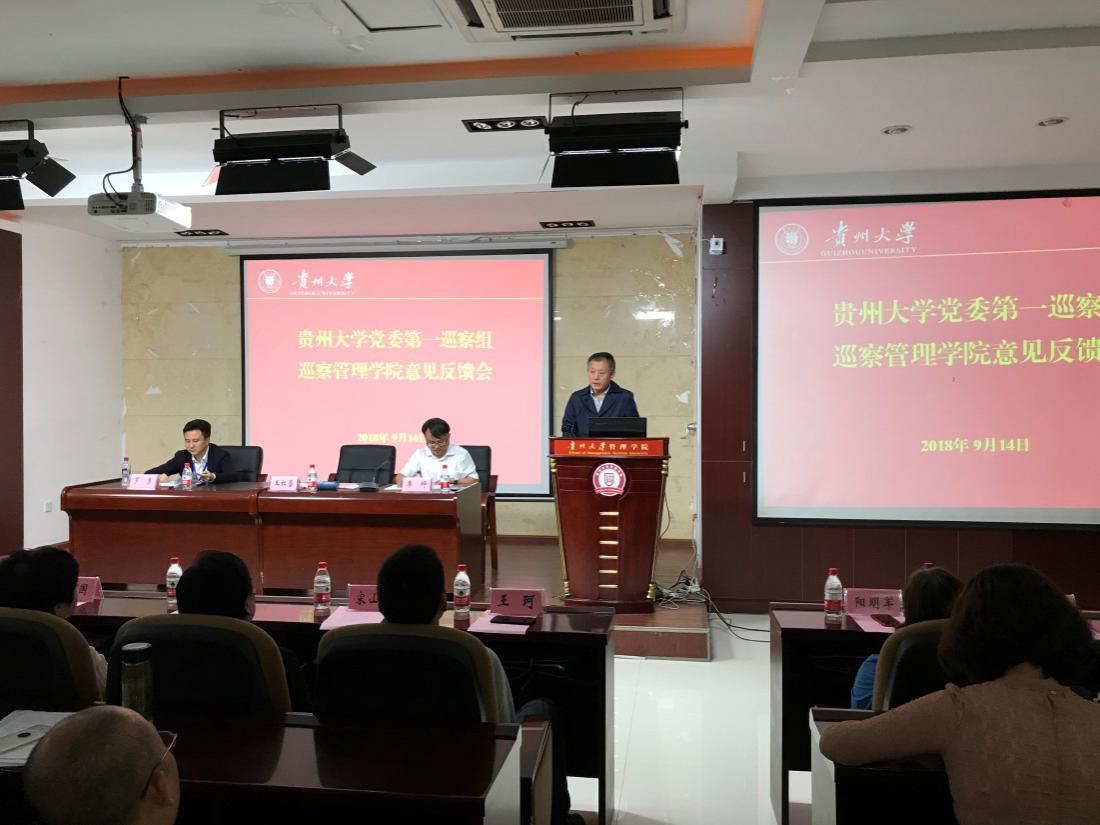 校党委第一巡察组组长罗勇组长首先肯定了管理学院近几年来取得的成绩,并以“文科振兴”的高度评价了管理学院拿到的两个一级学科博士点,实现了贵州大学文科博士点的突破。