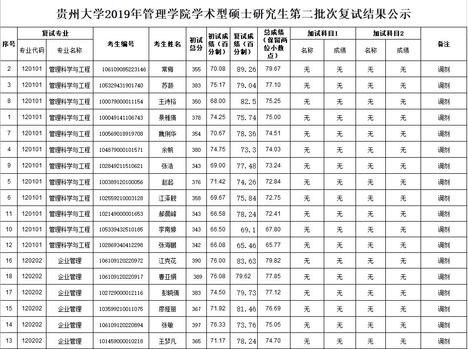 贵州大学2019年硕士研究生复试结果公示(管理学院第二批次)