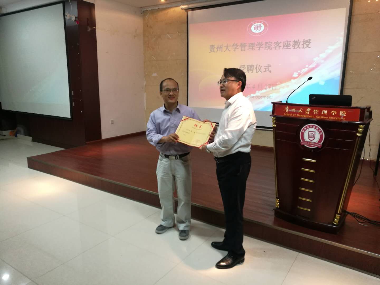 讲座由乐动官方网站副院长王婷教授主持,管理学院全体本科及18级研究生参会,并由李烨院长为赵忠教授颁发贵州大学客座教授聘书。