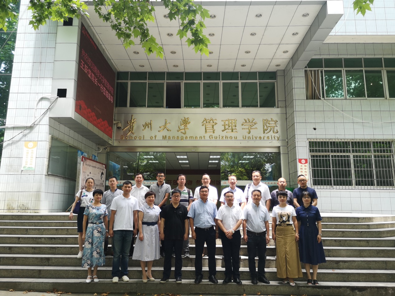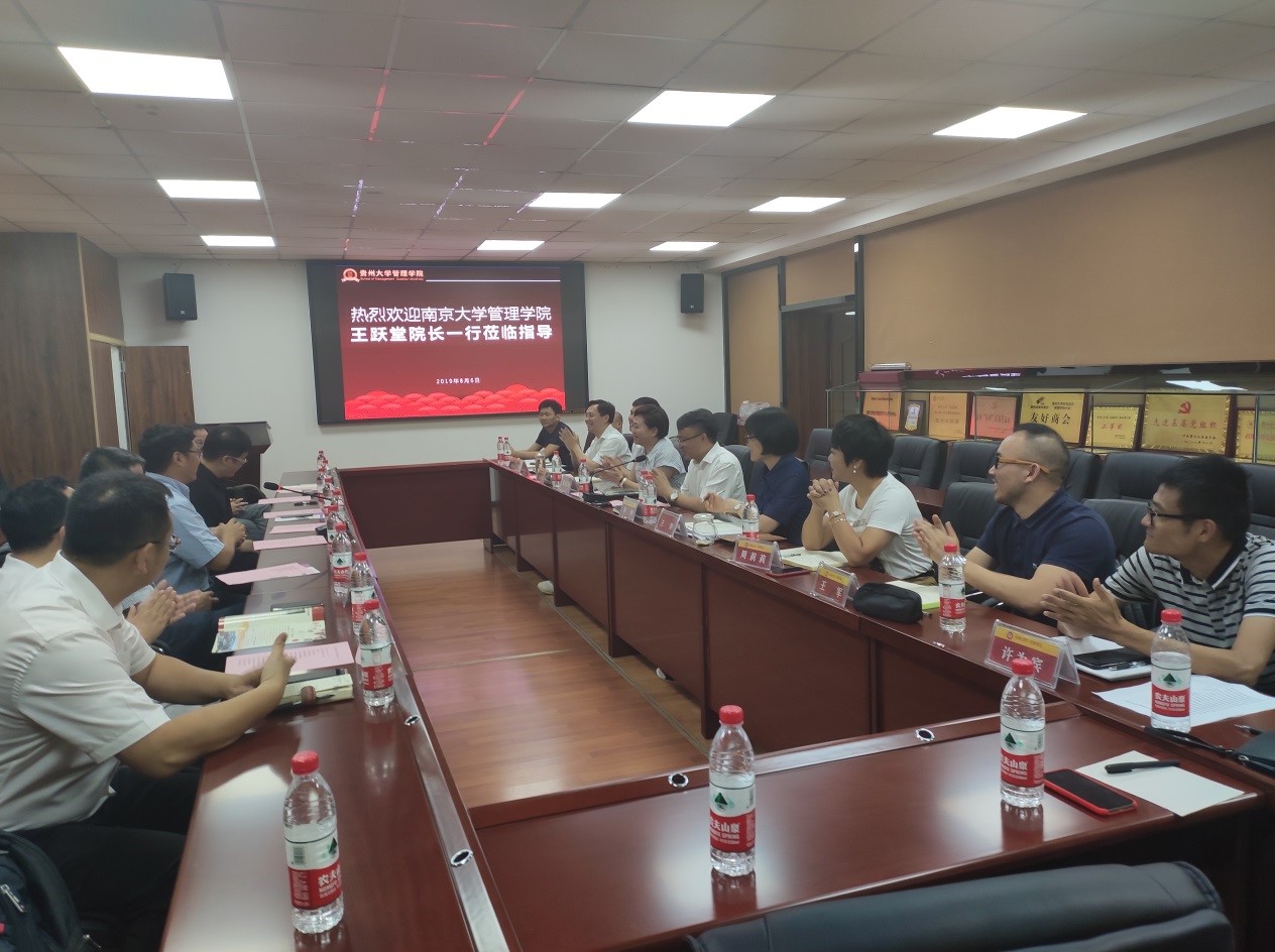 会上,李烨院长对王跃堂院长一行到访管理学院表示欢迎。李烨院长向南京大学管理学院的嘉宾们介绍了贵州大学的发展历程及管理学院的现状、学院发展的总体思路、师资队伍结构、学科专业及服务地方经济建设等相关情况。王婷副院长介绍了我院在科研及国际交流方面的情况;周莉莉副院长介绍了我院研究生学位论文管理及EMBA/MBA的发展情况;宋山梅副院长介绍了我院本科教育在教学质量方面等的情况。王跃堂院长介绍了南京大学管理学院的基本情况,重点介绍了南京大学管理学院学科发展及师资培养的具体办法。随后双方就学术科研、教学、人才培养、等方面进行了交流探讨。最后李烨院长向王跃堂院长重点介绍了贵州大学及管理学院设立科研特岗的具体情况,希望双方在科研、师资培养等方面建立战略合作关系,王跃堂院长表示高度赞同。会后,李烨院长向王跃堂院长赠送了礼品并合影留念。