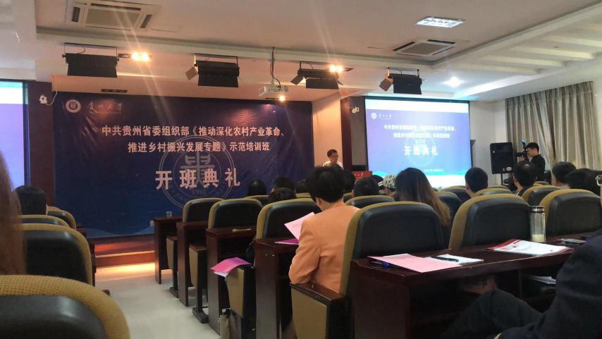 9月23日,中共贵州省委组织部、贵州省农村农业厅《推动深化农村产业革命、推进乡村振兴发展专题》示范培训班开班典礼在东校区管理学院三楼报告厅举行。省农业农村厅党组副书记、副厅长胡继承,贵州大学校长宋宝安院士,管理学院党委书记王秀峰教授,院长李烨教授,副院长王婷教授,副院长宋山梅教授和EDP中心主任张勇教授出席了开班典礼。