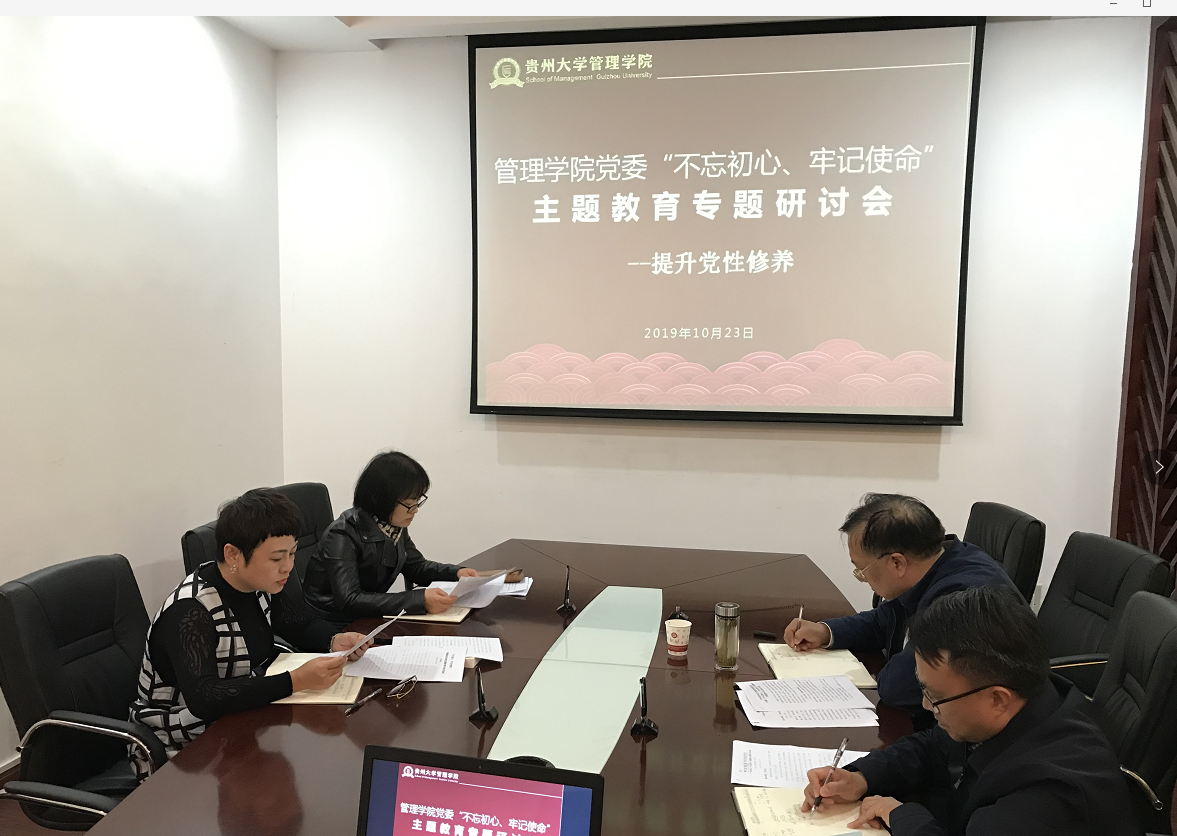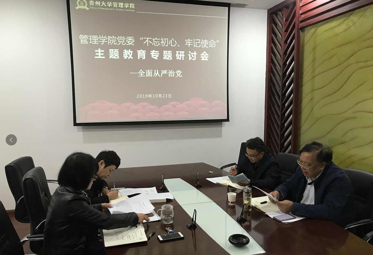 2019年10月23日中午13:00,管理学院党委在致远楼三楼小会议室召开主题教育专题研讨第二次会议。学院党委领导班子成员参加会议,会议由学院院长李烨主持。