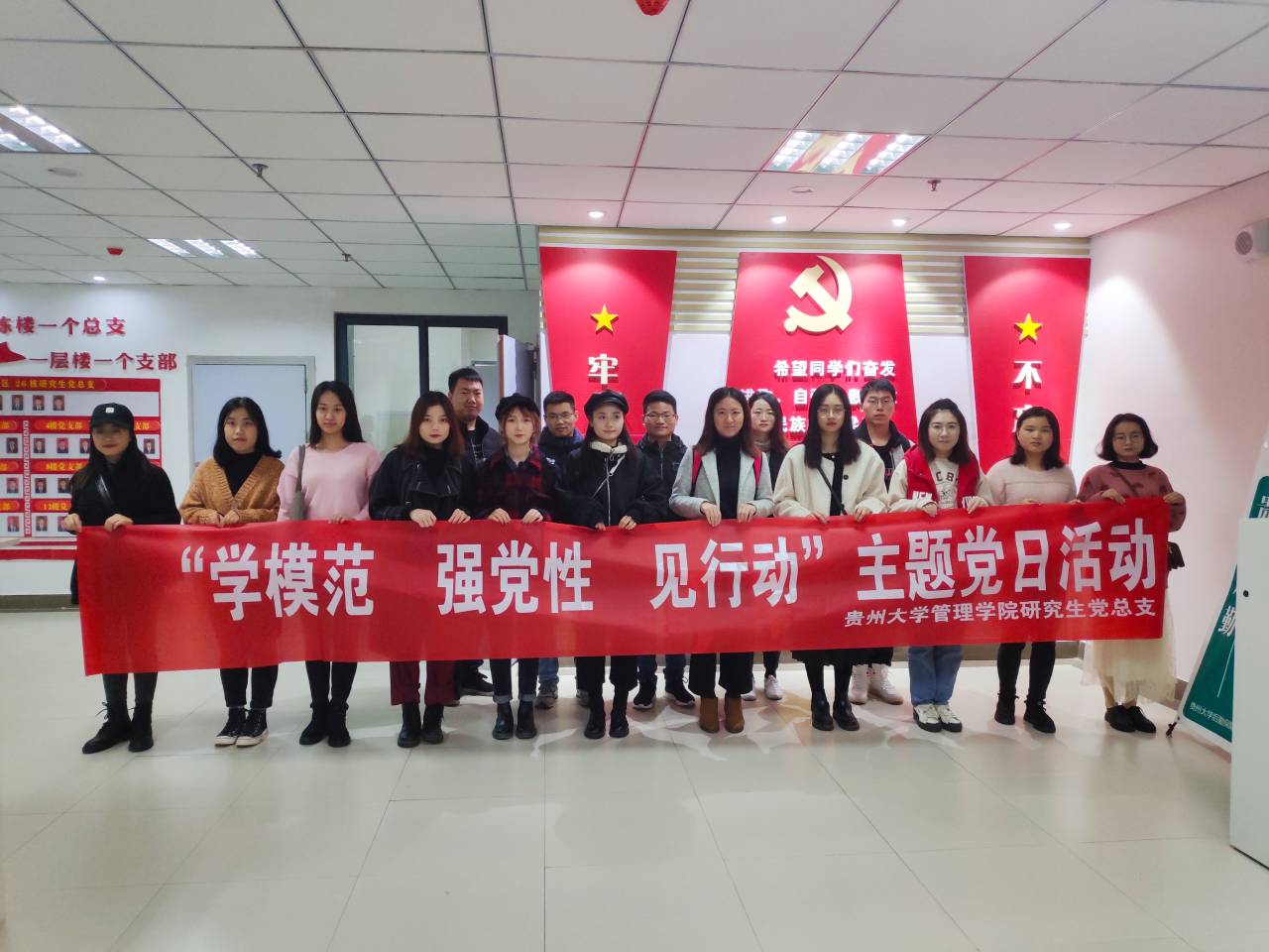 为进一步增强党总支的凝聚力,完善党组织建设,加强对模范党总支的学习,1124日上午,管理学院研究生党总支组织了“学模范 强党性 见行动”的主题党日活动,带领管理学院2019级全体研究生党员及2018级、2017级研究生党员代表,一行16人,参观了贵州大学26栋特色党支部示范区。