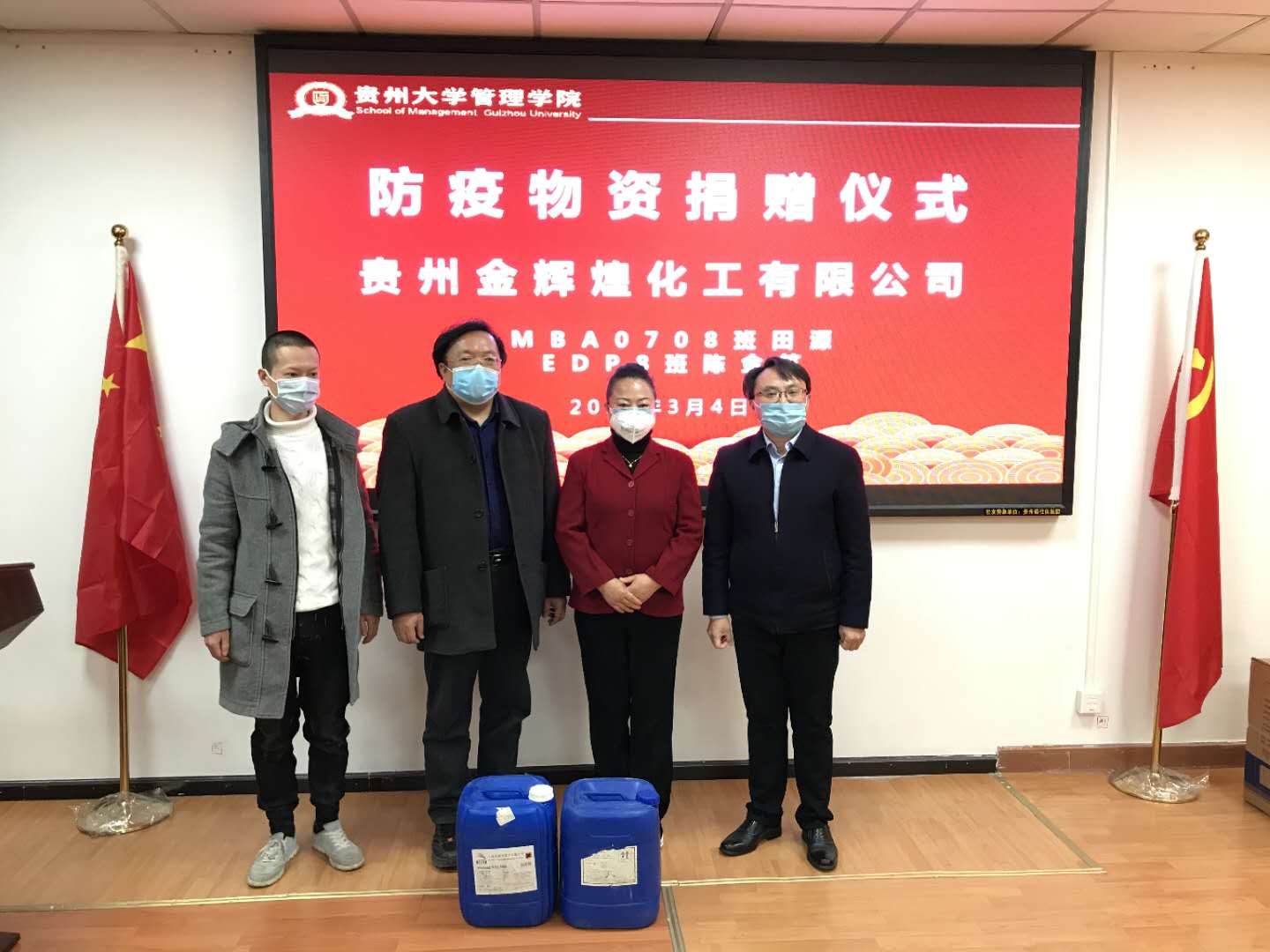 沧海横流,方显英雄本色。困难当前,方显责任担当。疫情发生以来,社会各界都在防控疫情、复工复产复教方面积极贡献力量。3月4日上午10:30,一场暖心的捐赠仪式在乐动官方网站陈列室举行。为在疫情防控物资紧缺的关键时刻,助力贵州大学“停课不停教、停课不停学”,经乐动官方网站联系对接,乐动官方网站校友企业贵州省中小企业服务集团捐赠口罩3000只,贵州金辉煌化工有限公司捐赠84消毒液1吨。乐动官方网站党委书记王秀峰,院长李烨,副院长王婷、宋山梅,办公室主任陈健,对外合作办公室主任王云,EMBA14期班贵州中小企业集团董事总经理孙大奎及办公室人员,MBA0708班贵州金辉煌化工有限公司总经理田源、EDP八班陈金筑出席了捐赠仪式,宋山梅副院长主持捐赠仪式。