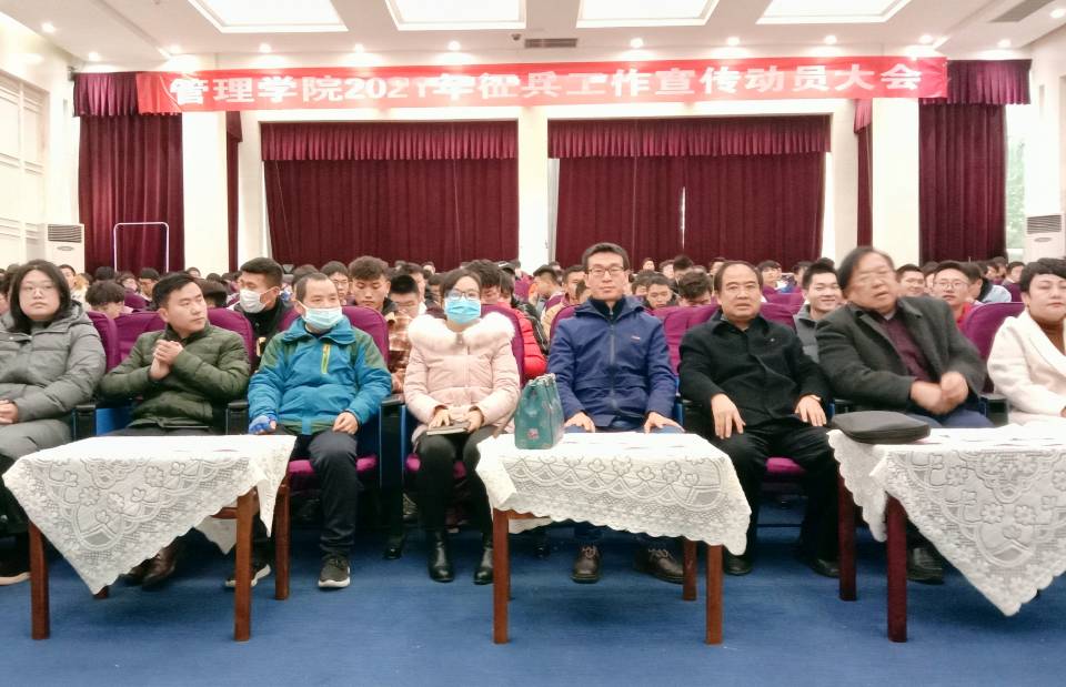 为响应国家新时代号召,深入落实征兵工作。20201229日下午1640,管理学院2021年征兵工作宣传动员大会在东校区一号行政报告厅举行。贵州大学学生处副处长张瑞良,管理学院党委书记王秀峰,管理学院副院长罗敏、周莉莉、宋山梅,管理学院全体辅导员、教学科老师、各班班主任和管理学院2018级、2019级全体适龄男同学参加了本次动员大会,本次动员大会由院党委副书记洪影秋主持。