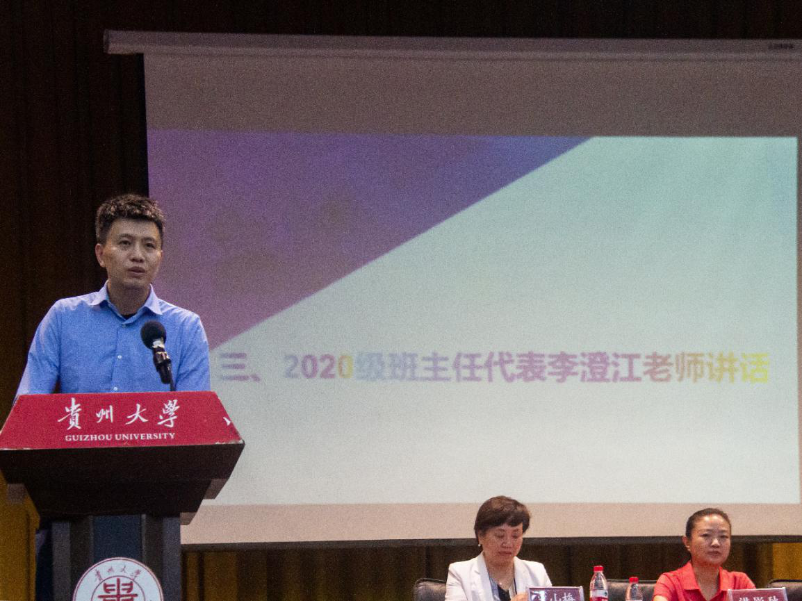 介绍到会领导及老师后,李澄江老师代表2020级班主任发言,在讲话中李老师建议同学们要养成率真的性格,认真做事的态度,诚实守信的品格,积极乐观的生活方式,更重要的是学会感恩。
