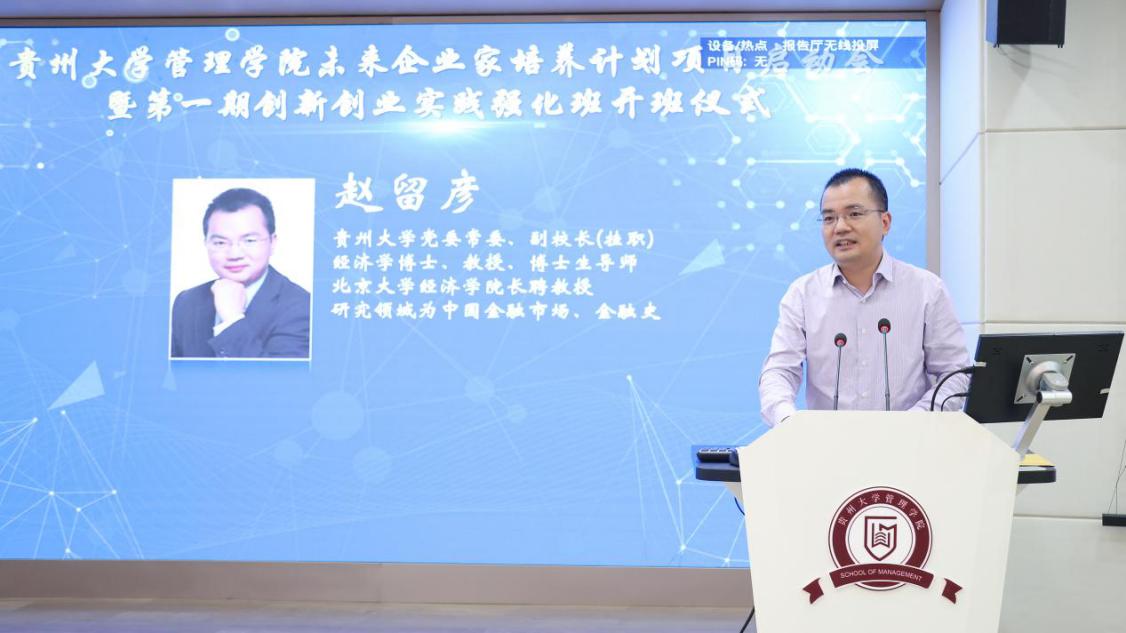 贵州大学副校长赵留彦讲话,对学院实施好未来企业家培养计划作了重要指示,对第一期创新创业强化实践班提出了具体要求。他指出乐动官方网站未来企业家培养计划既“仰望星空”,又“脚踏实地”;致力于培养能够促进地方经济社会发展,富有国际视野、战略思维、诚实守信、社会责任感、团队精神和创新创业能力的高素质经营管理人才。要求学员要具有现代管理思想和先进管理理念、熟悉市场经济运行规律;具有强烈的创新创业精神和竞争意识;能够适应市场经济发展需要和熟悉国际化经营规则。