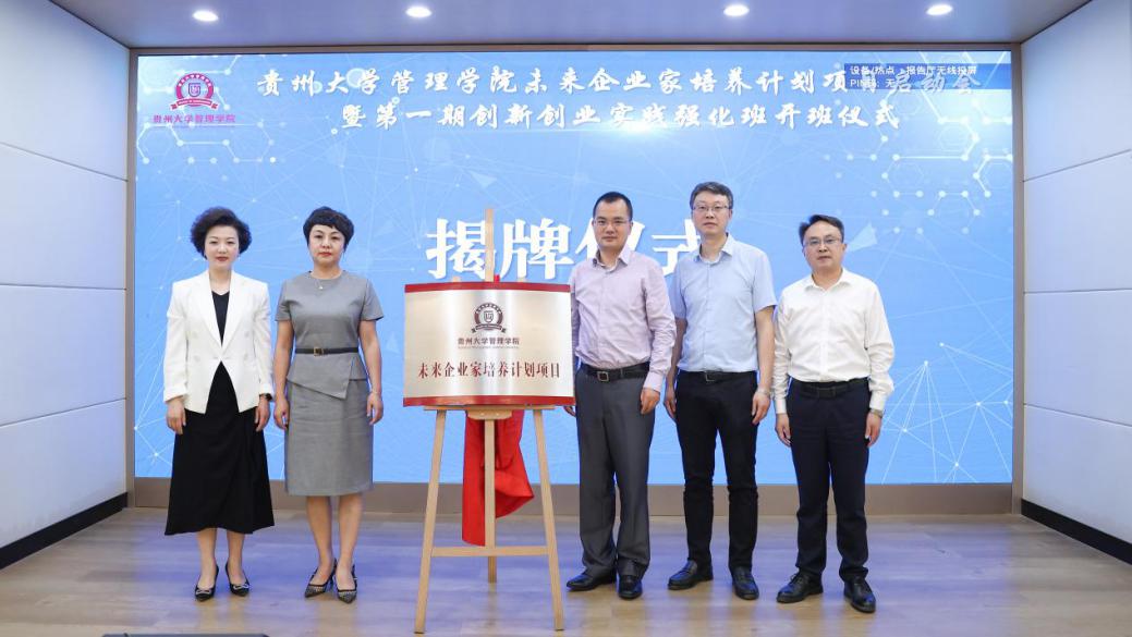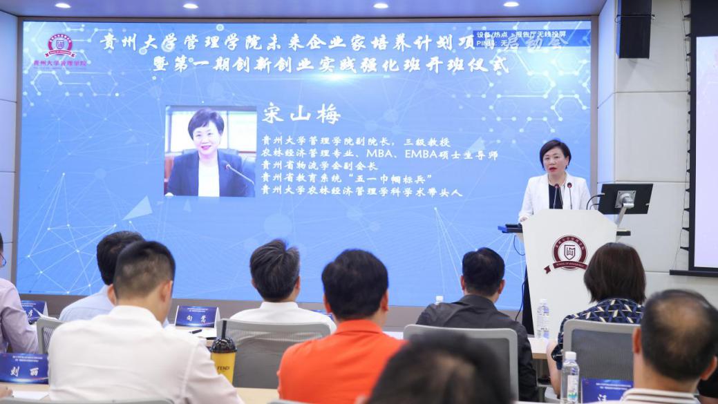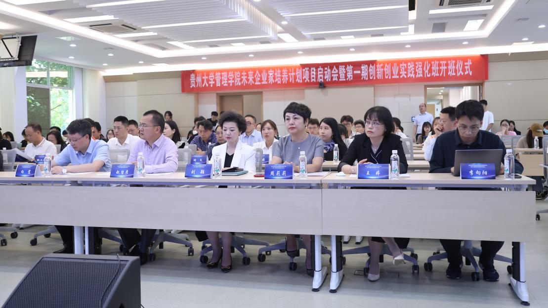 5月18日下午,乐动官方网站未来企业家培养计划项目启动会暨第一期创新创业实践强化班开班仪式在三楼报告厅举行。贵州大学党委常委、副校长赵留彦,贵州大学对外合作处处长刘颖,贵州大学教务处处长向嵩,贵州大学校团委副书记杨晓椿,贵州大学科技园副主任李向阳,贵州大学党委委员、管理学院院长李烨,贵州大学正处级组织员、管理学院党委副书记(主持党委工作)周莉莉,管理学院副院长王婷,管理学院副院长李本光,管理学院副院长宋山梅,管理学院党委副书记邓琳出席会议。出席会议的还有校内外“双创”导师及校友企业家。管理学院各科室、各系、各中心部门老师代表及第一期创新创业实践强化班学员参加仪式。