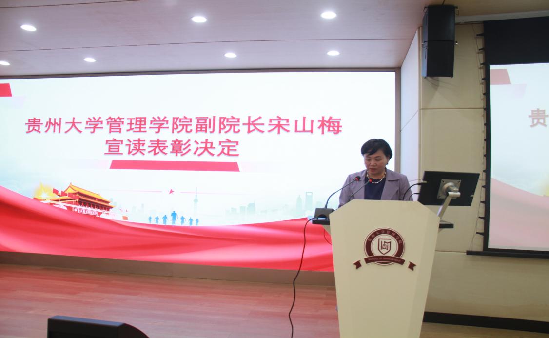 贵州大学正处级组织员、管理学院党委副书记(主持党委工作)周莉莉讲话。她表示,各位学子站在毕业的重要关口,即将奔赴各自的人生道路,开启新的一段人生旅程,因此,更要胸怀远大理想,矢志成为有用之才,不断提高自己,为实现中华民族伟大复兴的中国梦而奋斗。把在学校学到的知识与技能运用到实际工作和生活中,为社会做出更多的贡献。在未来的发展道路上,遇到困难和挑战时,要勇于面对、坚定信心,脚踏实地、开拓进取,不断提高自己,不断创新发展,为实现自己的人生价值而不懈努力。
