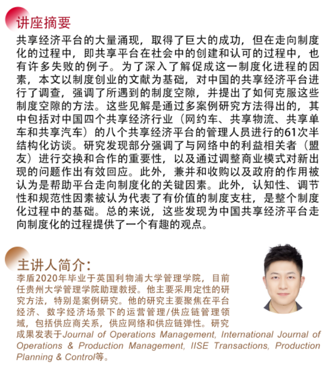这次学术交流主要聚焦于中国共享经济平台的运营管理机制,特别探索了在中国共享经济场景下,平台如何克服制度空隙,最终实现制度化的过程。乐动官方网站近年来一直致力于高质量发展,研究成果发表在UTD24ABS4*ABS3*等期刊。