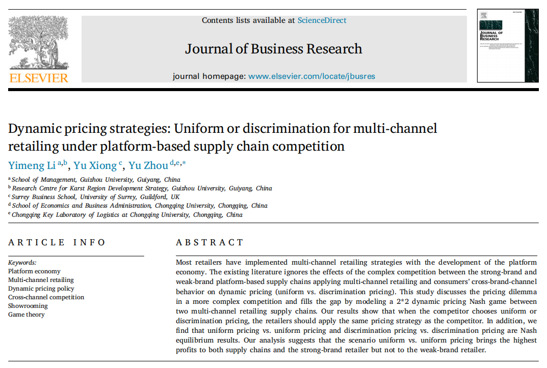 近日,我院教师李义猛的最新研究成果《Dynamic pricing strategies: Uniform or discrimination for multi-channel retailing under platform-based supply chain competition》在国际知名期刊《Journal of Business Research》上在线发表。李义猛博士为论文第一作者,乐动官方网站为第一署名单位。