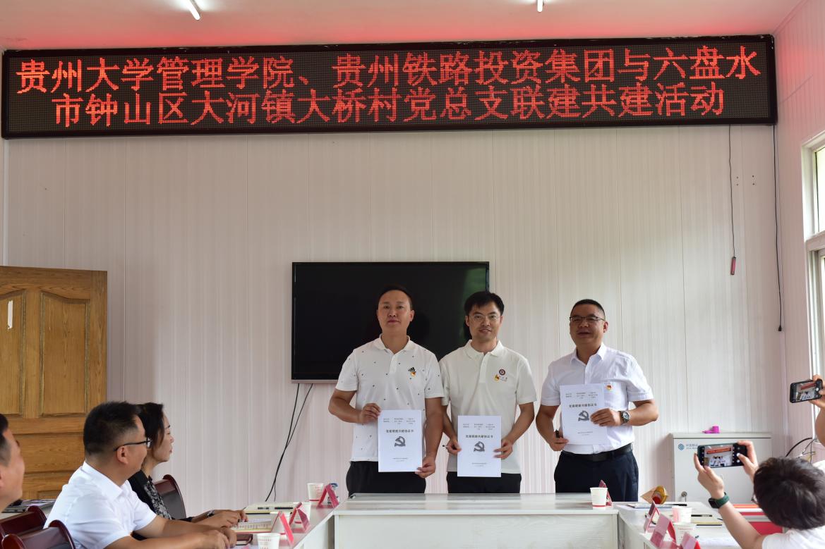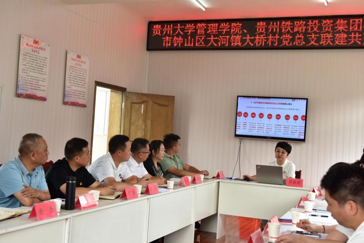 为庆祝中国共产党成立102周年,学习贯彻落实党的二十大精神,把学习贯彻习近平新时代中国特色社会主义思想主题教育走深、走实,2023719日,贵州大学党委正处级组织员、管理学院党委副书记(主持党委工作)周莉莉、管理学院党委副书记邓琳、管理科学与工程系教工党支部书记陈刚、研究生第二党支部书记龚潇潇以及支部党员代表等一行11人同贵州铁路投资集团董事会秘书和党委组织部(人力资源部)主任余松、贵州铁路投资集团安六(叙毕)公司党委书记、董事长李万波等6人共赴六盘水市钟山区大河镇大桥村和大湾镇腊寨村分别开展党支部联建共建活动,旨在通过高校、企业和乡村三方进行党建联建,实现高校、企业党组织与农村基层组织的深度融合,充分发挥高校在乡村振兴中的作用,提升乡村党建工作的质量和水平,推动农村经济社会发展全面进步。