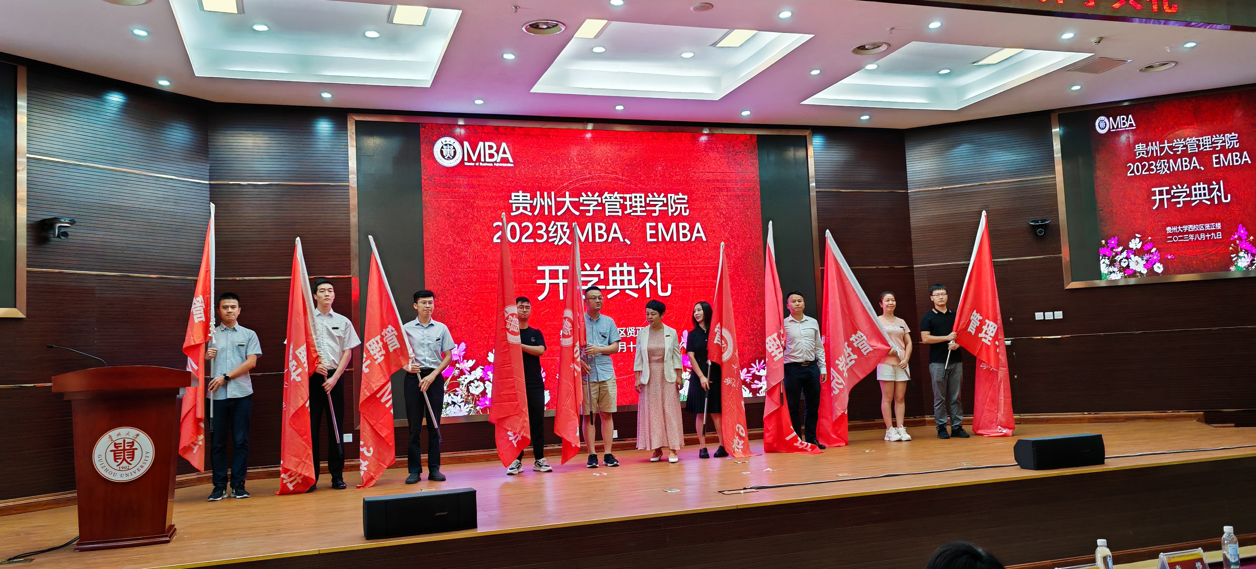 首先管理学院院长李烨教授致辞、MBA导师代表刘遗志副教授、2022级研究生老生代表胡梦阳和2023级EMBA新生代表龙庆进行了发言,最后在场领导为各班学生代表佩戴校徽,贵州大学党委正处级组织员、管理学院党委副书记(主持党委工作)周莉莉教授郑重地为各个班级授予班旗。