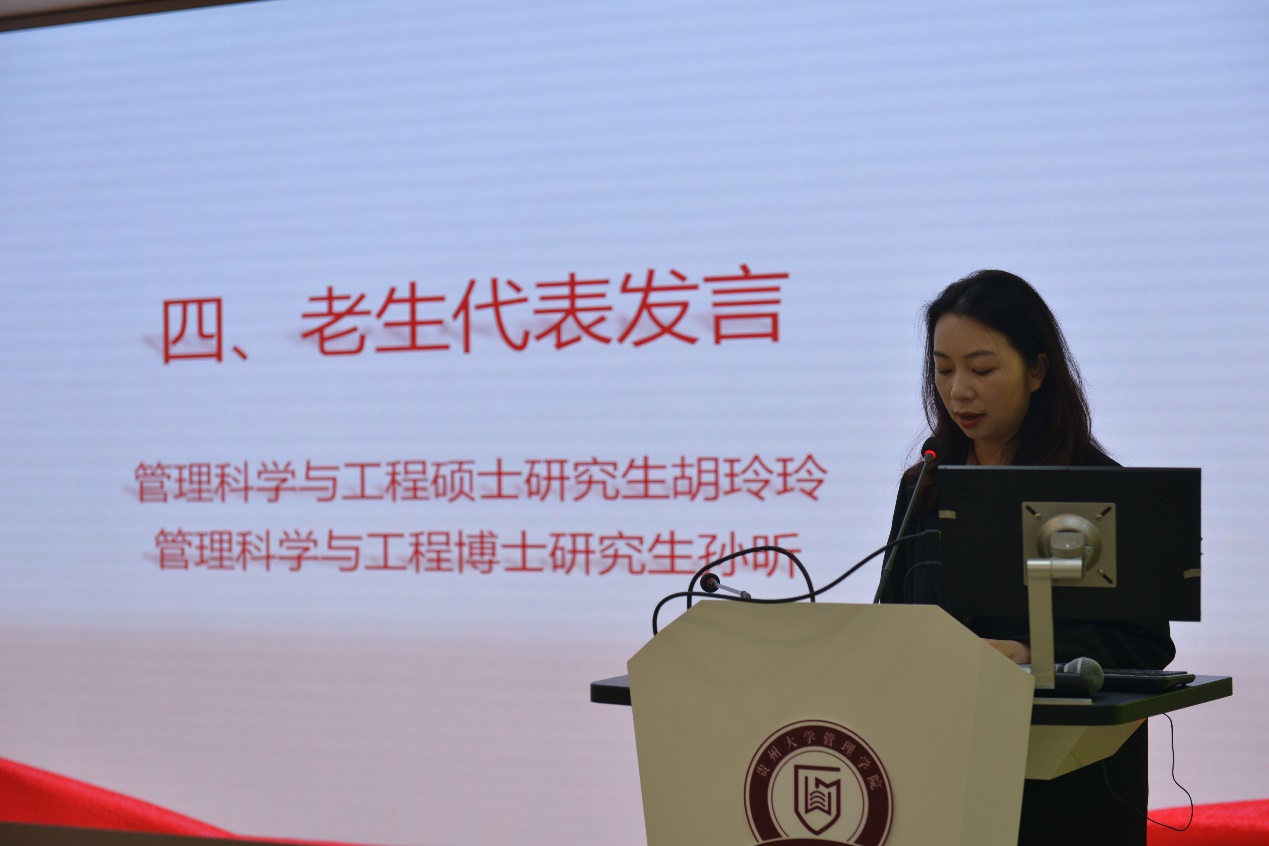 老生代表管理科学与工程硕士研究生胡玲玲、管理科学与工程博士研究生孙昕分别分享了自己的求学经历,为新生提供了宝贵的建议。她们提醒新生:我们应该时刻怀揣对科研的敬畏和激情,在科研中锻炼自己强大的内心,在生活中保持乐观心态,遇到事情全力以赴、不留遗憾。