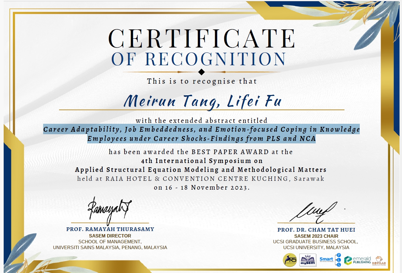 此次研讨会还邀请了Emerald出版社组织的编辑,讨论了如何在高水平期刊上发表论文;同时,来自全球各国的教授、学者和博士生们也纷纷汇报了自己近期的研究成果。可喜的是,汤美润老师及其研究生付礼菲(2022工商管理专业)合作的论文“Career Adaptability, Job Embeddedness, and Emotion-focused Coping in Knowledge Employees under Career Shocks—Findings from PLS and NCA”深受评委会青睐,赢得了最佳论文奖项。此次成就标志着乐动官方网站在国际学术界的影响力进一步提升,同时也为研究生培养提供了国际化的视野和实践平台。