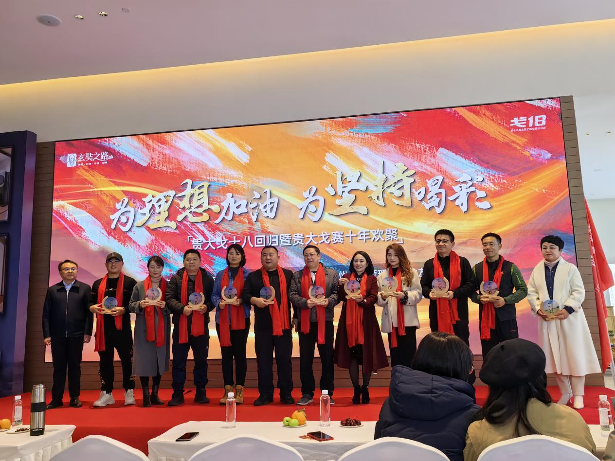 20231223日,戈十八回归暨贵大戈赛十年欢聚庆祝活动隆重在中铁文旅青岩康养小镇举行。今年是玄奘之路戈壁挑战赛第18年,也是贵大参加戈赛10年。贵大管院院长、校友会会长李烨,贵州大学党委正处级组织员、管理学院党委副书记(主持党委工作)周莉莉,管理学院副院长王婷、管理学院党委副书记、纪委书记邓琳、西部戈友联盟会长蒋磊、管理学院校友会执行会长张钊、MBA校友会会长汪健,贵大研究生导师胡文(校友)、中铁文旅贵阳公司总经理胡永清、副总经理梁济光、130余名戈友、校友、各届友人以及贵大EMBA“18”品牌赞助商、合作伙伴代表齐聚盛会,为戈十八喝彩,为戈十八战队中的每一位勇士感到自豪,为贵大戈友的坚持加油!