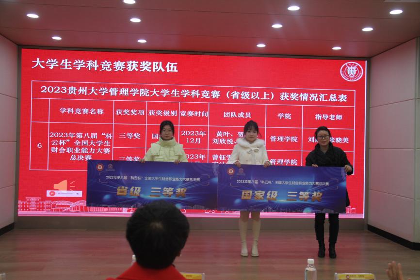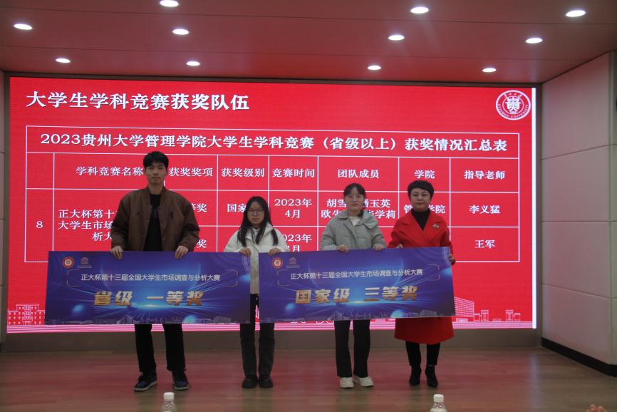 大会最后,贵州大学党委正处级组织员、管理学院党委副书记(主持党委工作)周莉莉总结发表讲话,她指出学院高质量完成了2023年度的各项赛事活动,取得了佳绩,并鼓励管理学院师生在新的一年里要根据学科特色,科学选择各项赛道,努力再创佳绩辉煌!