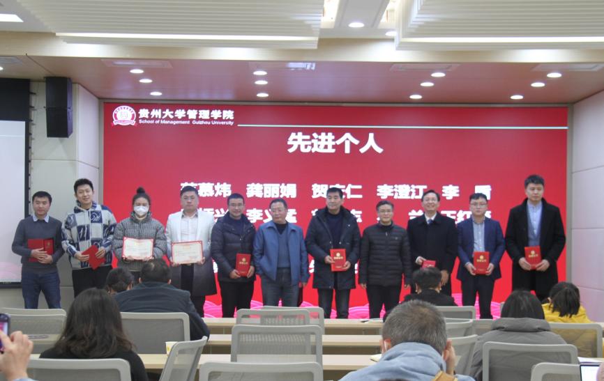 随后,学院对2023年度管理学院“先进个人”“先进部门(集体)”进行表彰,学院领导为获表彰的集体和个人颁发荣誉证书。共计表彰“先进个人”48人,“先进部门(集体)”6个。李烨院长对获得表彰的个人和集体表示祝贺,并勉励大家在2024年接续奋斗,再创佳绩。