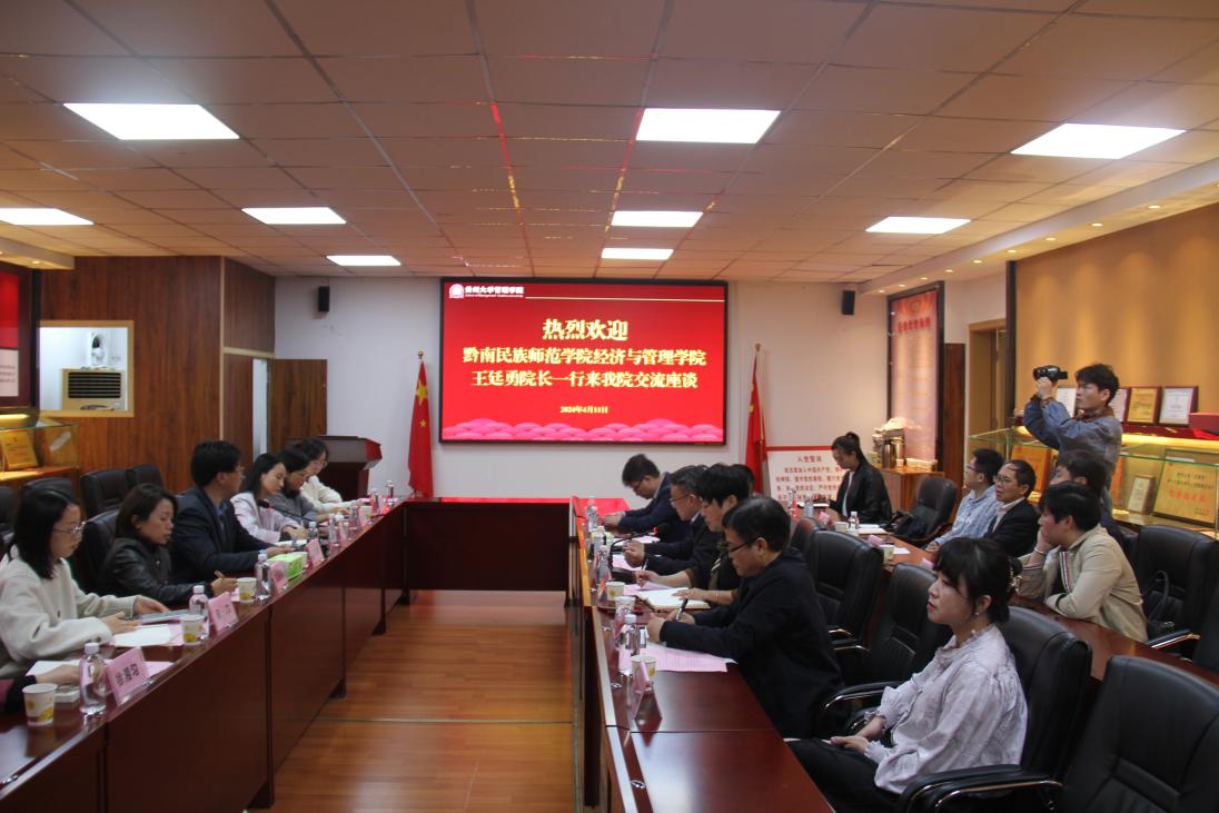 为加强高校合作交流,推动贵州教育高质量发展,411日上午,黔南民族师范学院经济与管理学院院长王廷勇一行来我院交流座谈,学院部分党政领导及相关系主任、科室负责人、教师代表参加此次座谈,校党委正处级组织员、院党委副书记(主持党委工作)周莉莉主持此次交流座谈会。