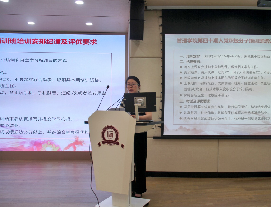 典礼第二项,由学院党委副书记邓琳老师宣读《管理学院第四十期入党积极分子培训班培训安排、纪律及评优要求》和《管理学院第十九期党员发展对象培训班培训安排及纪律考核要求》,。两项准则对入党积极分子和党员发展对象的培训时间安排、纪律要求、学习内容及考核评优等作了详细阐述安排。邓书记指出,各位学员大家应严格遵守规定,自觉规范自身行为,端正个人态度,学习过程中要保证百分百完成率,为加入中国共产党做好思想和行为上的准备。