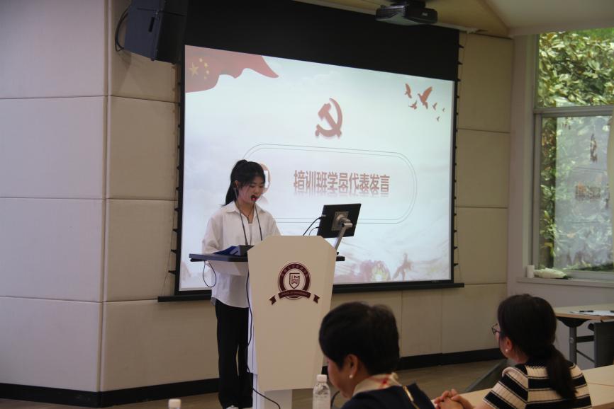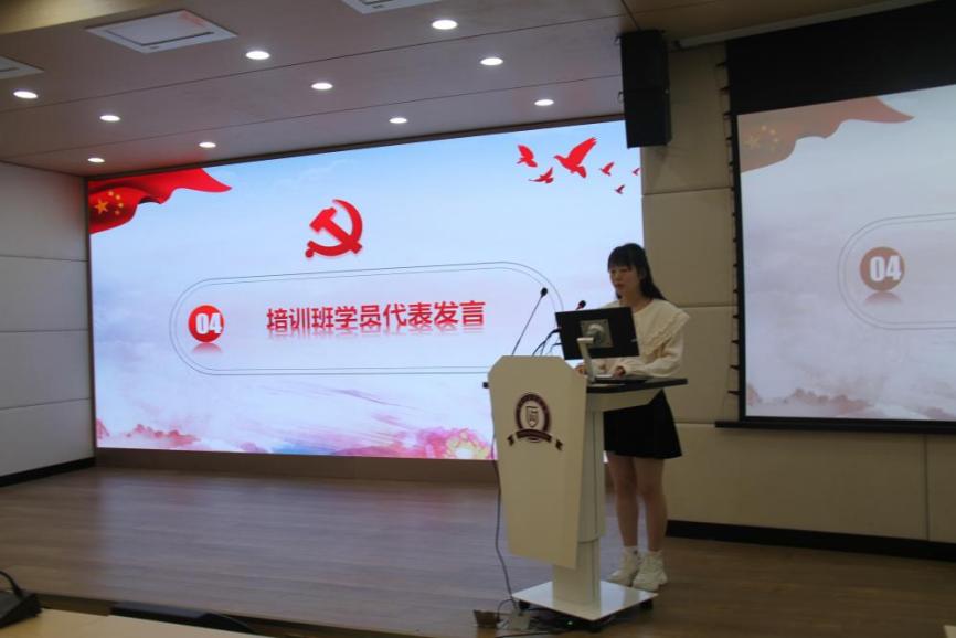 典礼第四项紧接着,培训班学院代表发言。入党积极分子培训班学员生代表肖蝉娟和党员发展对象培训班学员生代表贺晓琳先后上台发言。她们共同指出表示,要把党员理论学习作为思想武器并将所学所悟践行到日常生活,始终保持对党的忠诚和热爱,并呼吁同学们以更高标准要求自己,在培训期间努力学习、提升自我,认真学习党的基本理论知识,努力提高自身政治和思想道德水平,为今后更好地为党和人民服务做好准备。