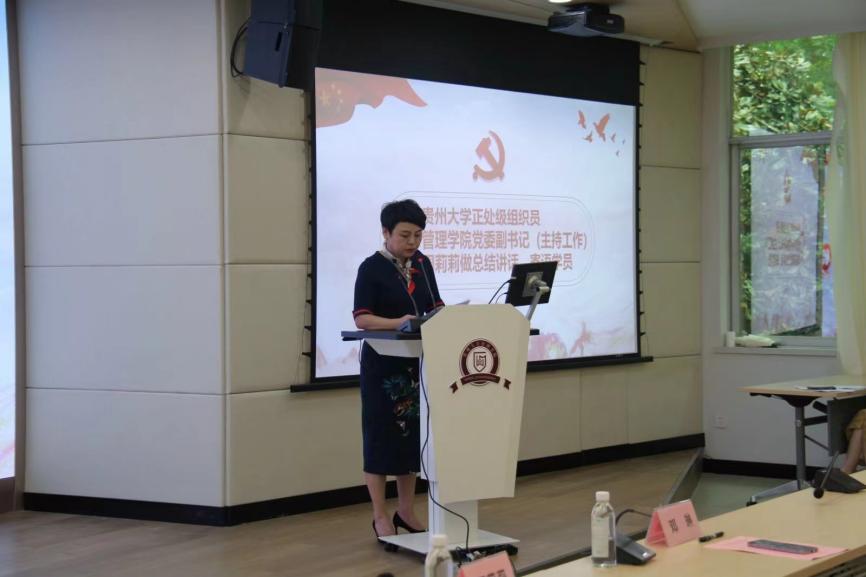 典礼第五项最后,贵州大学党委正处级组织员、管理学院党委副书记(主持党委工作)周莉莉老师对此次典礼进行总结讲话。她强调,党校培训是进行共产主义理想信念教育的长项工作制度,是管理学院加强思想政治工作、坚持进行共产主义理想信念教育的体现,对高校各老师和学生进行共产主义理想教育,培育和造就一批具有真才实学,又具有坚定共产主义信念的社会主义事业接班人和建设者是学院应尽的义务,期待同学学员们通经过学习,之后成长为党旗下的中坚力量,为社会做出更多贡献,发挥更多力量。