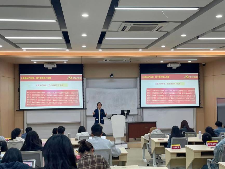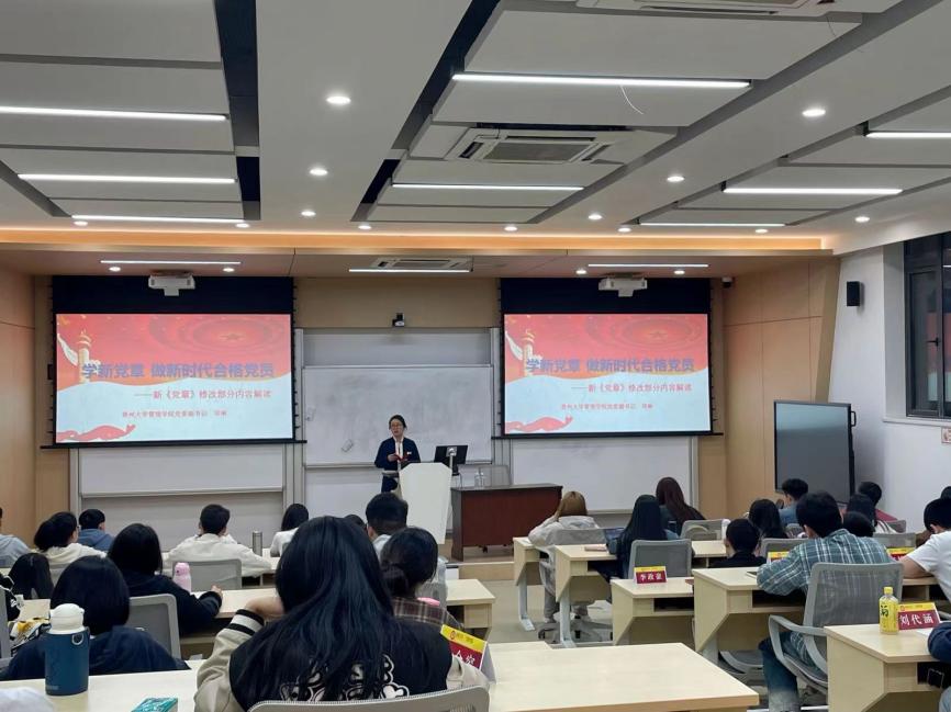 2024425晚,管理学院党委副书记邓琳在管理学院102教室为学院分党校第四十期入党积极分子授课,本次课程主题为“学新党章,做新时代合格党员”。