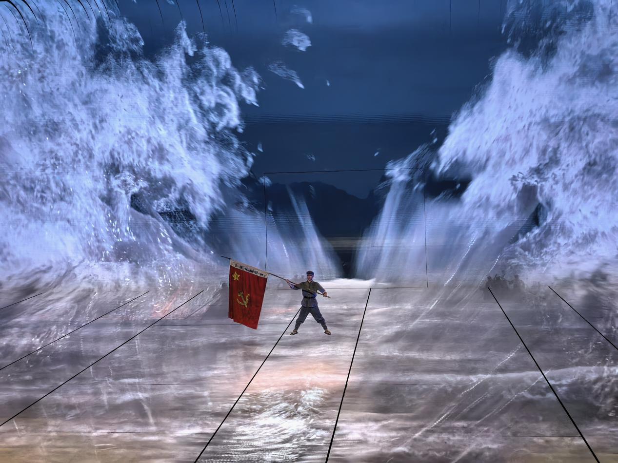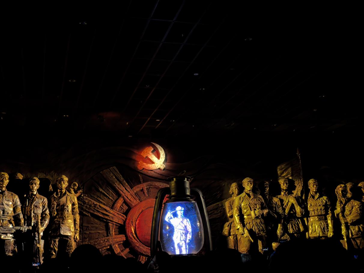 在“ 砥砺征途”篇章,学员进入雪山区域时,狂风暴雪迎面而来,随着阵阵的呼喊声,战士们的身影出现在崖畔上,如同雕塑般望向远方。通过感官真实传达,切身体会红军战士在崇高的革命信念和顽强意志下,与极其险恶的自然环境进行艰苦卓绝的斗争,倾听发生在长征路上可歌可泣的感人故事,亲身体验用双脚丈量“爬雪山过草地”的革命场景。来到“ 胜利丰碑”篇章,通过超大环幕剧场,展现红军会师的壮观场景。以“一面红旗、一盏马灯”作为跨越时空的核心线索,见证红军在长征中的信仰之路,并带领中华民族走进新时代。
