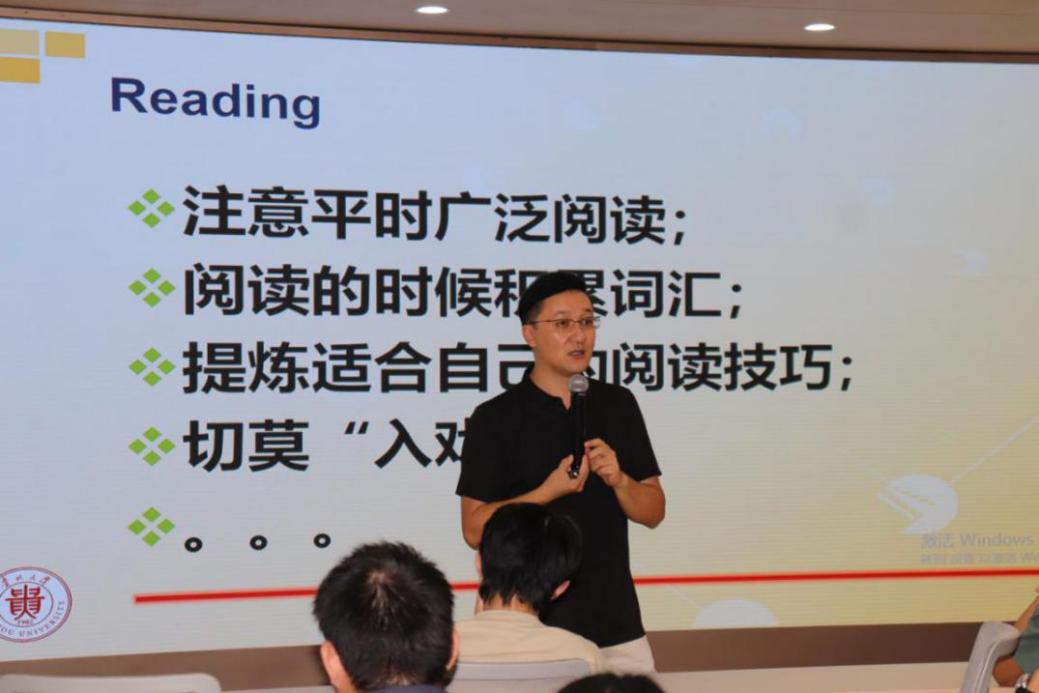 在“读写译训练”板块中,沈麟教授指出了四种高效学习的方法:注意平时广泛阅读;阅读的时候积累词汇;提炼适合自己的阅读技巧;切莫“入戏”。他强调同学们在外语学习中不要急于心切,要在日常学习中慢慢积累,在犯错后改过,不断充实外语知识。