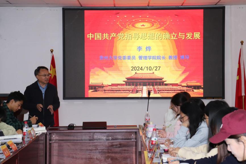2024年10月27日下午,管理学院第四十一期入党积极分子培训班专题党课在致远楼301室顺利开展。本次课程由贵州大学党委委员、管理学院党委副书记、院长李烨主讲,主题为“中国共产党指导思想的确立与发展”。