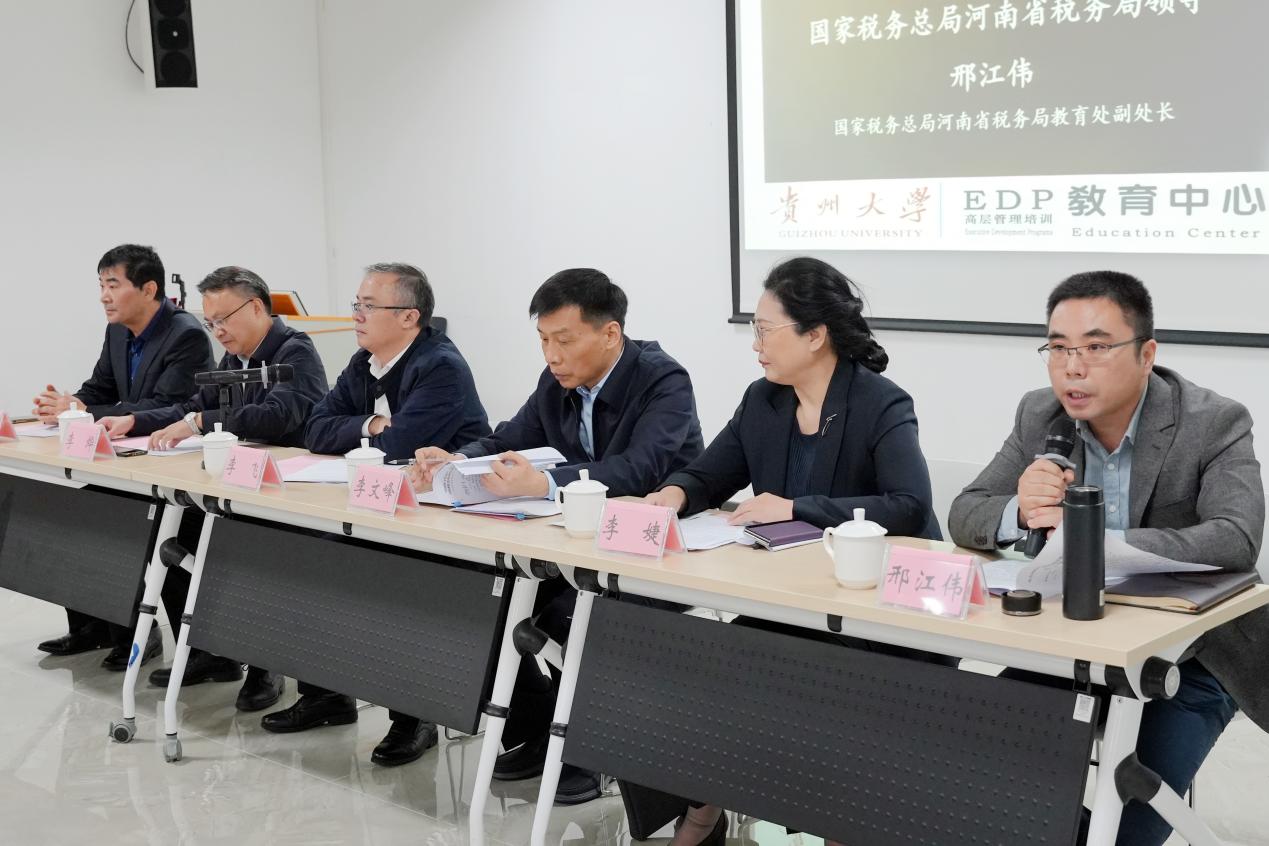 河南省税务局党委委员、总会计师李文峰,河南省税务局第四税务分局局长李婕,河南省税务局教育处副处长邢江伟,贵州大学党委常委、副校长李飞,贵州大学党委委员、管理学院院长、副书记李烨,乐动官方网站EDP教育中心主任张勇出席了本次开班仪式。