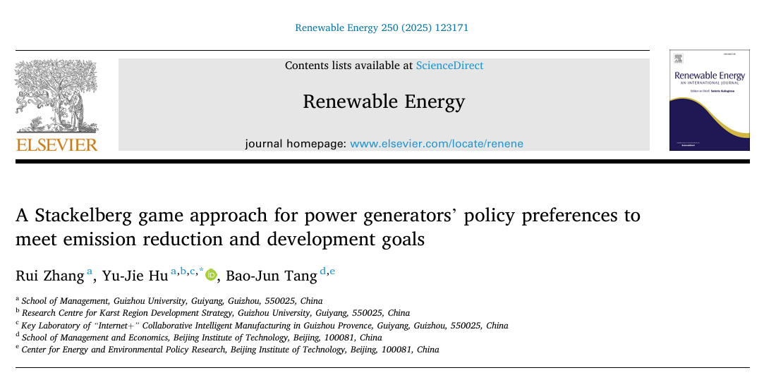 乐动官方网站副教授胡玉杰(通讯作者)及其指导的管理科学与工程系硕士研究生张锐在Renewable Energy期刊(中科院一区TOP期刊,IF9.0)发表文章《A Stackelberg game approach for power generators' policy preferences to meet emission reduction and development goals》。