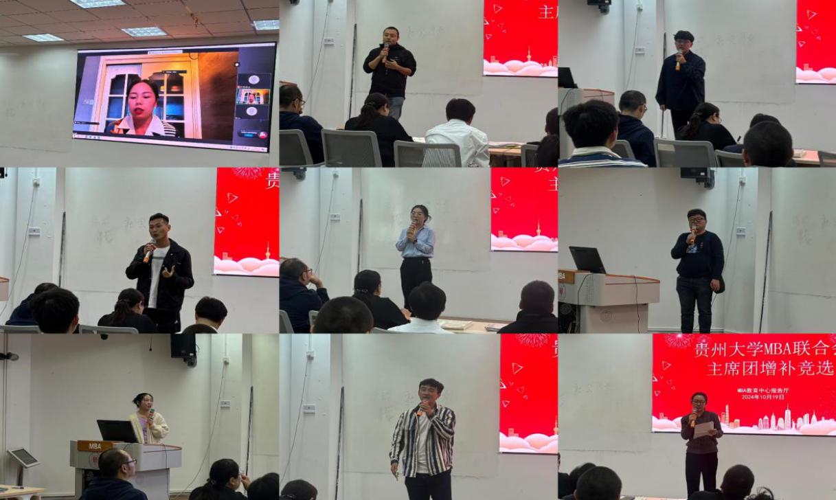 2024年10月19日下午,乐动官方网站MBA教育中心在MBA报告厅举行了“贵州大学MBA联合会主席团增补竞选”。MBA教育中心主任项凯标、副主任何跃勇、办公室主任芮丽华及中心全体工作人员,MBA第十届主席团成员和MBA2023级、2024级14个班级的学生代表共60余人参加了此次大会。